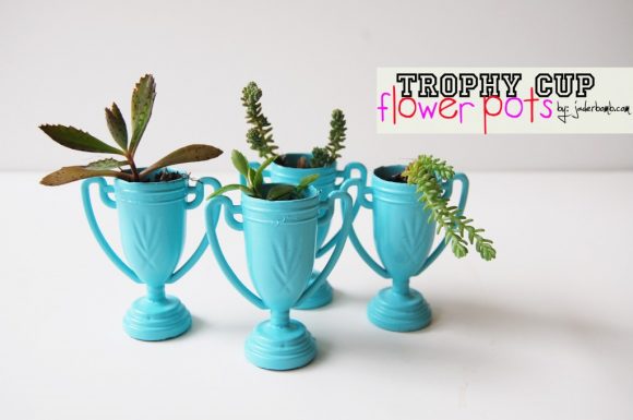 What do you do when you like the shape of something but find the color tacky, ugly, or just plain obnoxious? Attack it with a can of spray paint! That’s what Jaderbomb did with a package of plastic trophy cup party favors she found at the dollar store. A couple coats of teal later, they look entirely different and much more chic! They work great as tiny planters for succulents or other small plants, or you could fill them with candy or other treats. They would make great favors at a sports-themed party! [how to make trophy cup mini flower pots]