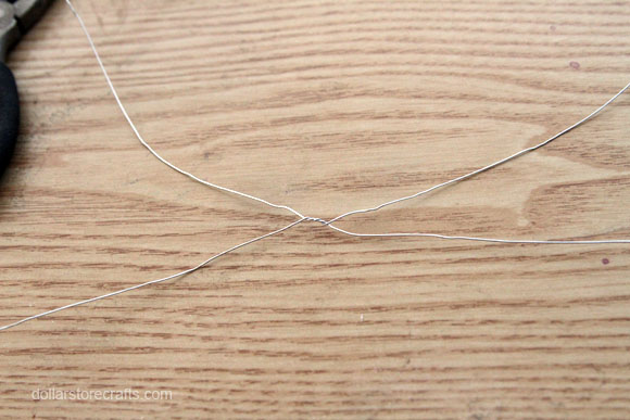 1. Cut two pieces of floral wire (about 14″ long) with your wire cutters. Place them in an X formation on your table, then twist together about 5 twists.