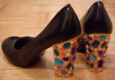 Another way you can get these done almost to the original heel. Is to use some clay for the base of the heel and push some gems into it. Ofcourse you would have to make the form of the heel and glue it on the heel. Because you can’t bake the shoe LOL.