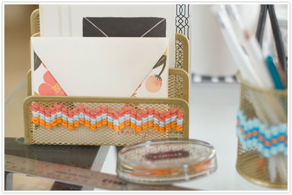 How many hours a day do you spend at your desk? If you’re spending that much time there, shouldn’t it be covered with things that make you smile? Ditch your plain, boring desk accessories in favor of these cheerfully stitched items. Chanel from Camille Styles took a standard mesh letter holder and pencil cup and used a coordinating color scheme of yarn to give them a colorful makeover that makes them more suited to her personality. They won’t make your work day and shorter, but they might make those hours behind your desk a little less tedious! [how to make a cross stitch desk set]