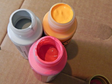 When I got back, I pulled out a few colors of Plaid paints in trendy neon colors so that could make the supplies look like they were part of set. I had decided to color block them to make use of a popular and graphic trend.