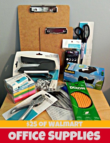 My challenge for this project was to make as many cool things as I could, using a $25 gift card to Walmart. My $25 bought me all the office supplies you see above: two sizes of clipboards, scissors, a calculator, a tape dispenser, a stapler (with staples and a letter-opener), a memo note holder (with notes), a hole punch, thumbtacks, pens and pencils.