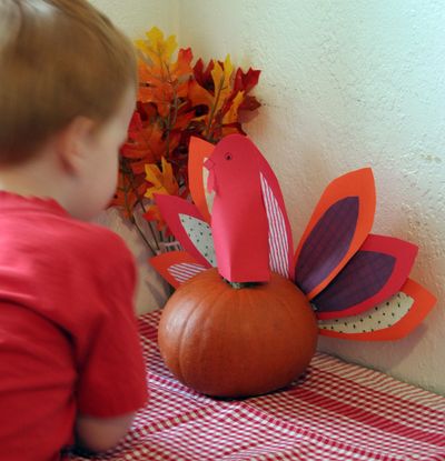 Happy Thanksgiving! Did you see my Pumpkin Turkey Centerpiece project over at Make & Takes? If you aren’t too busy cooking, you can make one with the kids today (or have them make it while you’re working!) I used my uncarved leftover pumpkins and on-hand paper to make it.