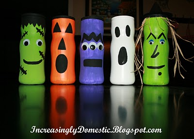 If you’ve got a toddler, chances are you have mpty containers from puffs laying around. Amy from Increasingly Domestic had a bunch of them. Inspired by the shape, she transformed them into an entire collection of Halloween characters. [how to make recycled puff container Halloween characters]
