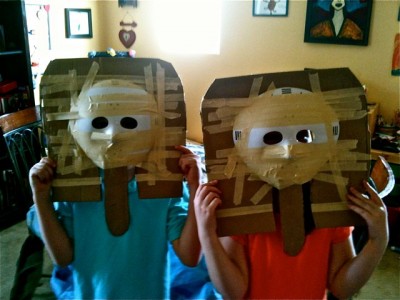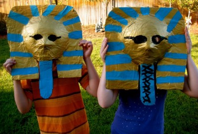 This fun costume idea came to us from DSC reader Sarah. After learning about Egyptian history, she and her kids made pharaoh masks! Sarah constructed the hockey-mask-and-cardboard bases, then let her kids go crazy applying papier-mache and paint. These kids seem destined to follow in their mother’s footsteps; Sarah is an artist with a wonderfully whimsical style. Make sure you take a minute to check out her website!