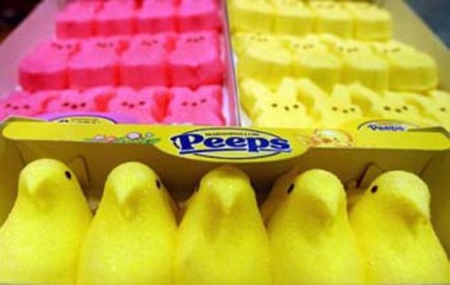 As back story, PEEPS® are an iconic Spring ‘treat’. They are Marshmallows, shaped like either yellow chicks or pink bunnies (Yellow and white PEEPS® chicks and bunnies came first, followed by pink, lavender, blue, green and orange). They are inexpensive, and bright, and artificial through and through. But there they are.