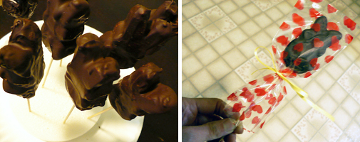 Rhonda’s mom LOVES Peeps, so she made these for her for her 60th birthday – chocolate covered Peeps! She used semi-sweet baking chocolate so that they wouldn’t be any more sugary than they are by nature. They turned out cute and sinfully yummy! Rhonda made the chocolate covered Peeps on bamboo skewers and stuck them in a styrofoam circle to dry. (You could also make this a display by putting the styrofoam in a flower pot, or adding decorative ribbon around the edges). To wrap them, she used favor bags that she’d originally ordered to use for her wedding favors, but they were backordered and came in three days after the ceremony. Go figure! But they were the perfect size to put over the Peeps and tie off with some ribbon from her stash. Rhonda boxed up a dozen of the finished, individually wrapped Peeps for her mom. Happy birthday, Rhonda’s mom! |