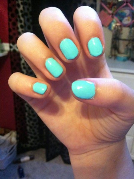 Once that has dried, paint your nails with the polish of your choice. These have to dry until they are 100% dry so that the painters tape won’t ruin the nail polish underneath when you peel it off. I recommend waiting an hour or two.