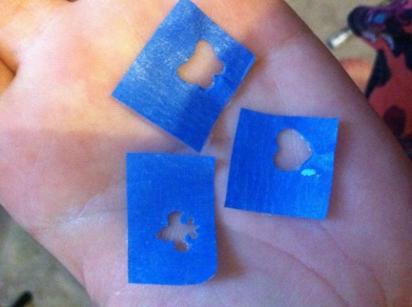 Take your mini punch and stamp out the design you would like on the tape. To make it easier when you go to put it on your nail, use scissors to cut them into smaller pieces. You can find these mini scrapbooking punches at various craft stores, I found mine for $1 each. They usually have a fun variety of designs you can choose from, so pick your favorites!