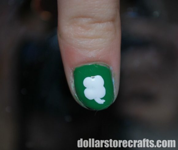 - Begin creating the clover. Decide where you want your clover to be on your nail and how big you want it. Once you have decided, place a small dot on your nail where the center of your clover will be. This will act as a reference point.