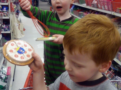 First stop, wooden food! I love these little wooden pizzas (and they have two or three flavors), and there are some other play foods, too. Dairy Queen ice cream treats, and cardboard groceries.