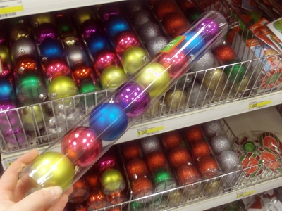 Cool fashiony colored ornaments – in case you need a color kick to your Christmas decor. Just a buck (and they come in small, too).