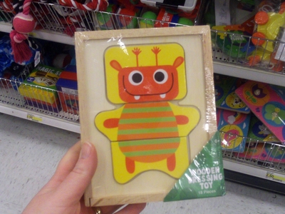 This is so cute! It’s a wooden puzzle toy that has several different pieces so you can switch the outfits on the puzzle. $2.50.