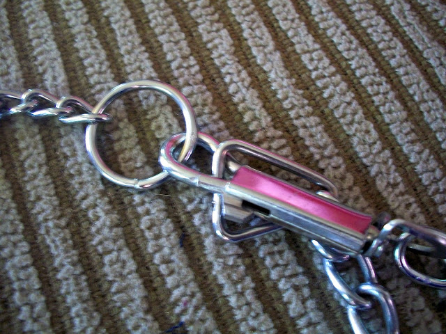 Neat idea, but I would suggest removing the dog leash clip (can be done using two pliers and bending an unjoined link or using a bolt cutter). Then use keychain rings to attach.